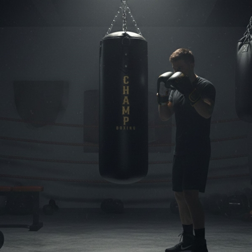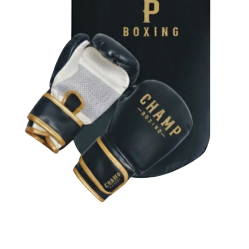 Champ Junior Boksesæt i sort/guld er det ideelle startsæt til børn og unge, der vil i gang med boksning derhjemme. Sættet fås i både 11kg, 15kg og 18kg og indeholder boksesæk, lette juniorhandsker, kæde og ophæng – alt hvad der skal bruges for at begynde træningen.