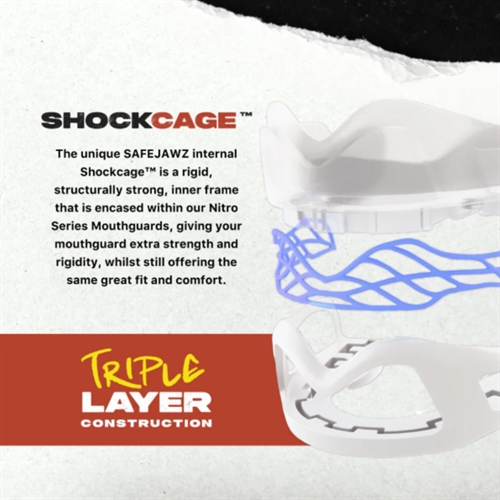 Safejawz Nitro Tandbeskytter – Hvid/Blå er topmodellen til dig, der ikke går på kompromis med beskyttelse og pasform. Tandbeskytteren er udstyret med en unik stødabsorberende indre struktur og har en antimikrobiel overflade, som holder beskytteren frisk og hygiejnisk – selv ved hyppig brug.